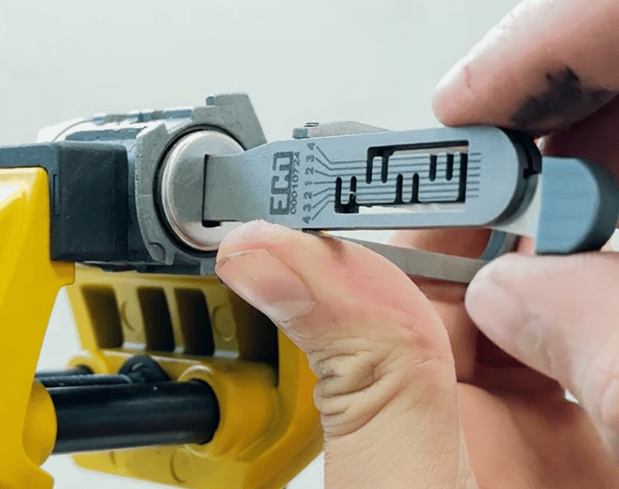A lockpick tool used for emergency opening determining the code. The main advantage of Ecodecoder are the guide channels – they limit the movement of lever/levers. This helps you prevent errors and it leads to better opening time.